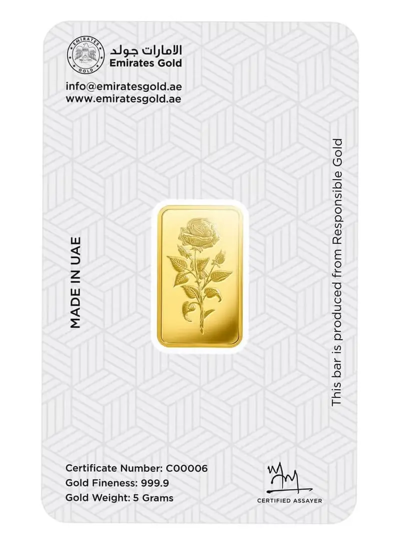 Emirates Gold produces a wide range of gold bullion bars which are refined up to 999.9 Emirates Gold Bar displays the attention to detail and craftsmanship associated with this well respected manufacturer. The front of the bar is stamped with the Emirates Gold logo together with the weight and fineness (999.9) of the bar. The reverse of the bar is beautifully decorated with a ‘Rose of Dubai’ image on a mirror finish background. This product is perfect as a gift item or as an initial purchase towards a new bullion collection. Your Emirates gold bar will be sealed within the manufacturer’s original attractive and tamper-proof certicard packaging which will protect your purchase and provide additional verification of the product’s authenticity for a future sale. Founded in 1992, Emirates Gold DMCC has grown to become the UAE’s leading gold refiner and producer, smelting over 200 tonnes of gold annually. As members of the DMCC and LBMA Associate Suppliers, Emirates Gold are highly regarded within the bullion industry and produce a range of high quality precious metal investment products in gold and silver. Available in 1g, 2.5g, 5g, 10g, 20g, 50g, 100g, 1 Tola, 5 Tola, 1/2oz and 1oz sizes. Make an investment in Gold Bars & Save your future.